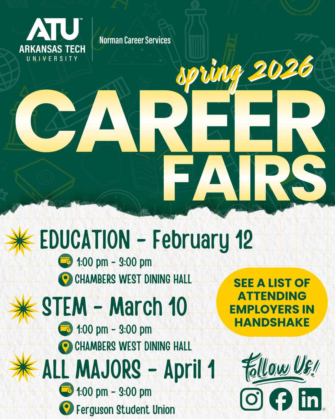 12 - Education Career Fair (1:00 - 3:00 pm) - Chambers West Dining Hall