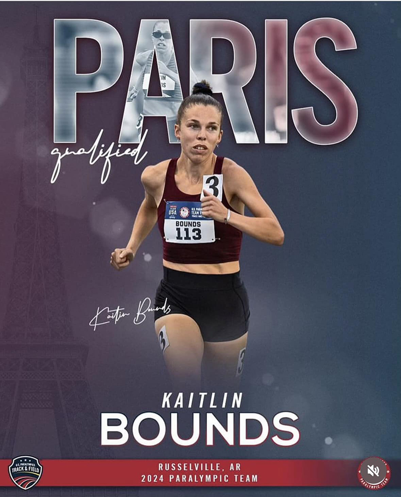 Kaitlin Bounds (BA History '14) will be a member of the Team USA Paralympic track and field team in the Paris 2024 Summer Paralympic Games Aug. 28-Sept. 8 in France. Bounds is the only Arkansan to earn a place on the Team USA Paralympic track and field team for Paris 2024.